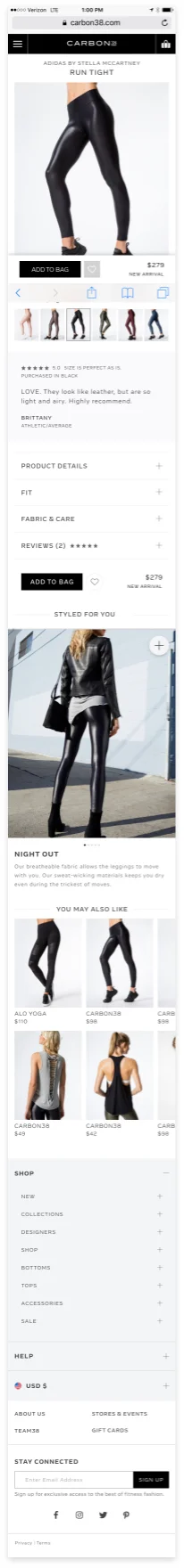 Carbon38 has been on the forefront of the athleisure trend, locking in 15 million dollars in funding from Footlocker in January. Despite its luxury branding, the website design was not consistent with Carbon38’s look and feel of its products. My job, as the sole UI/UX designer, was to elevate the Product Details Page, while making our customers feel catered to and special.